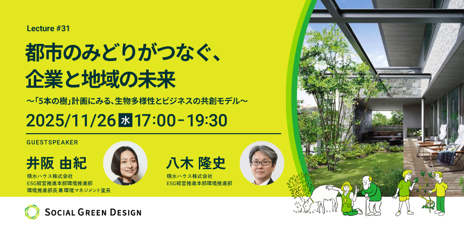 31回目を迎える今回のSocial Green Design Lecture では、積水ハウスで環境推進を担う 井阪 由紀 氏、同社の環境プロジェクトを長年リードしてきた 八木 隆史 氏 のお二人をお迎えし、これまでの取組みの成果や課題、そして都市におけるみどりの可能性や将来展望についてお話しいただきます。